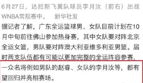 北京时间10月1日,根据《南方都市日报》的报道,本月中旬在佛山的全运会热身赛,除了外界关注的男篮国手赵睿有望登场外,此前在美国征战WNBA女篮国手李月汝同样有望回归,且亮相比赛。